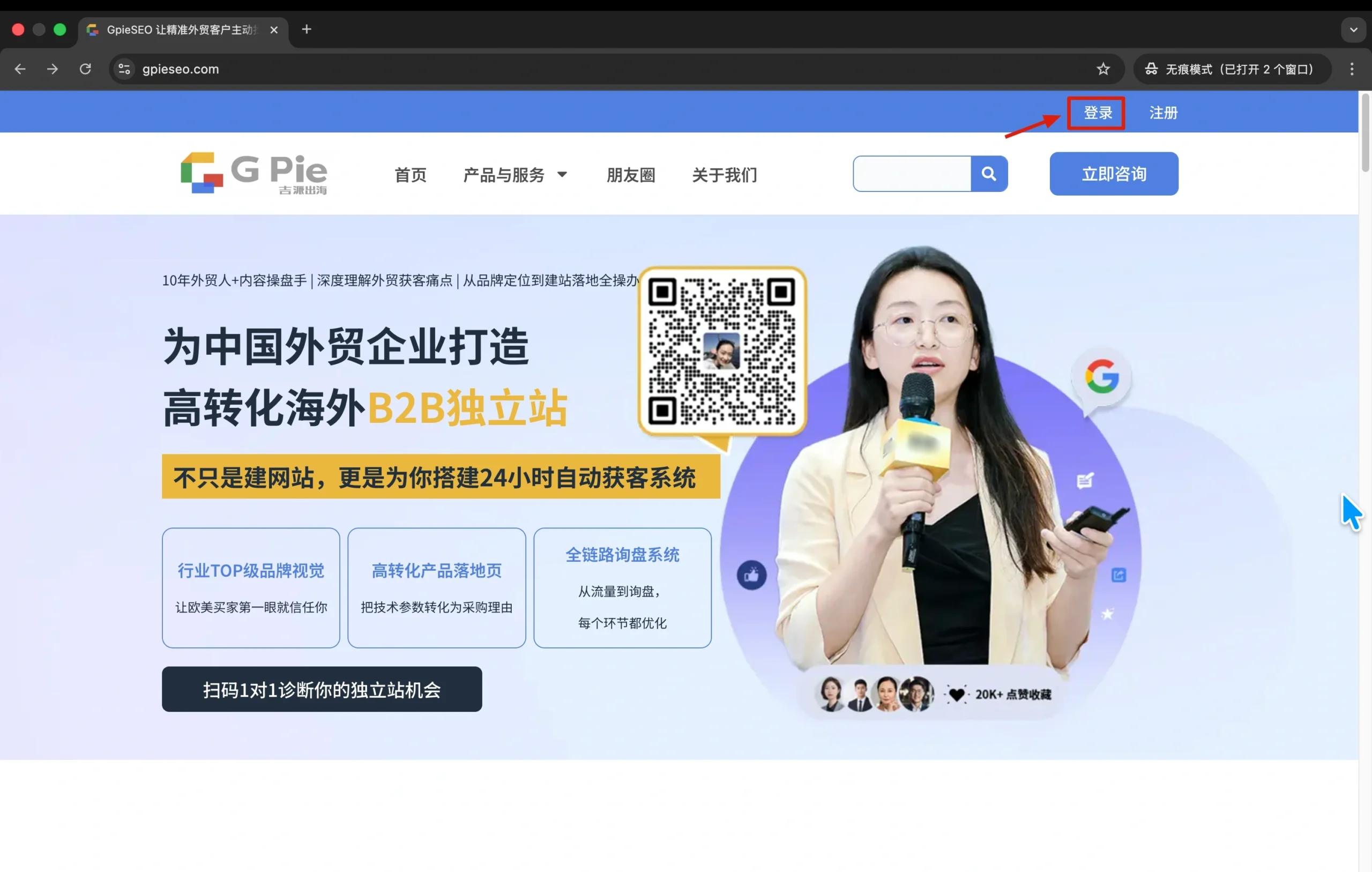 第一步:打开gpieseo.com网址,点击右上角「登录」按钮。