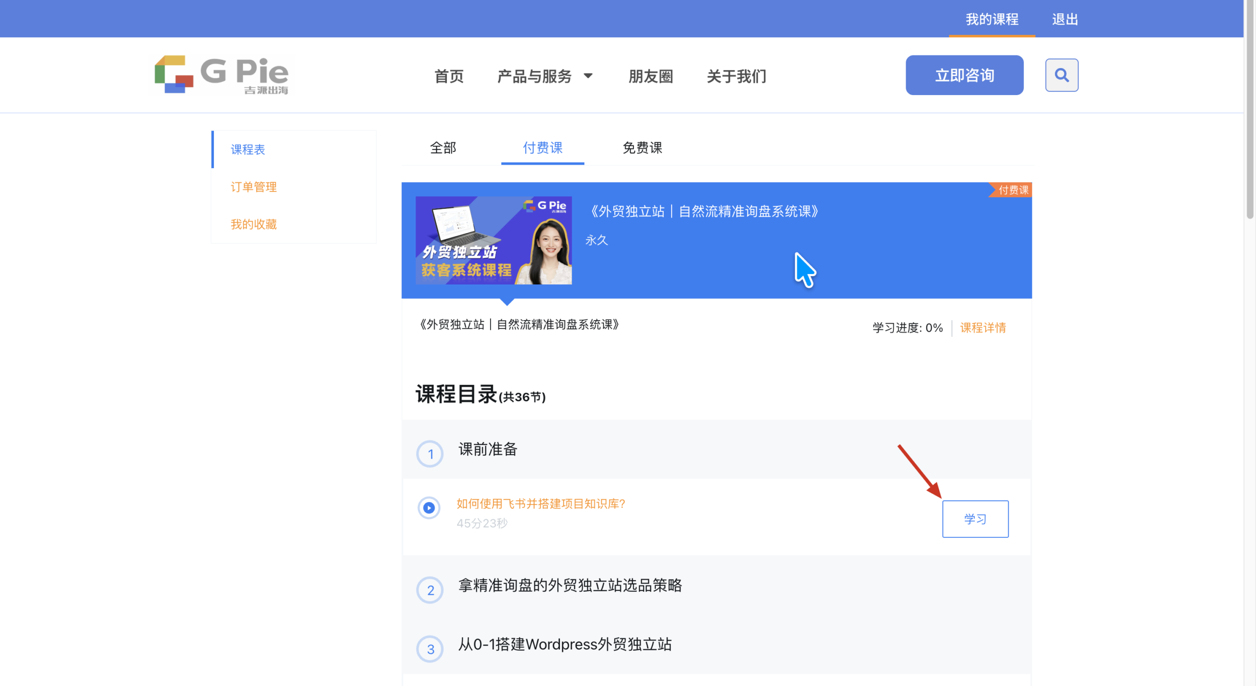 第5步:找到具体的课程标题,点击右侧的「学习」按钮,进行学习。