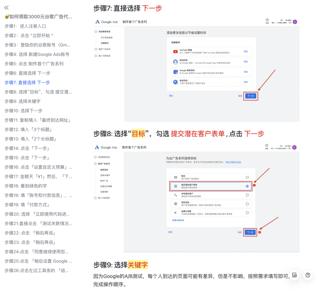 比如着陆页在哪里创建?一个合格的着陆页结构应该是长什么样的?投放的策略是什么?投放关键词怎么选?第一个广告系列怎么制作?广告文案要怎么写?